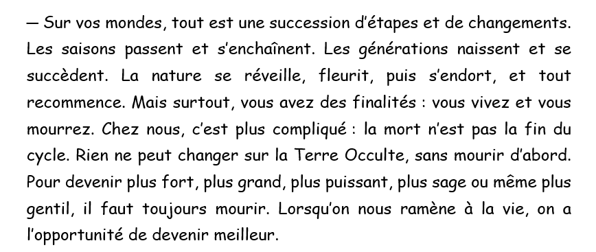 De leur côté, les personnalités des trois reines d’Angérium se tracent au fil du tournoi. Disons simplement que les couteaux volent bas comme dans tous les régimes monarchiques. De nombreux concurrents sont savamment présentés en cours de lecture dont le fabuleux Damnor de la Terre Occulte. Ce dernier explique à ses adversaires la différence entre sa Terre et les autres.